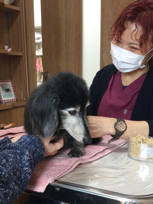 「ヘルニア」と「膝蓋骨脱臼(パテラ)」「気管虚脱」の症状で通ってくれているミニチュアダックスフンドのチロルちゃん(17歳)です🐶✨